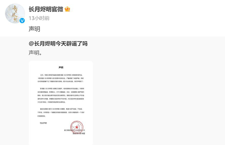 《长月烬明》方表示,对该剧的恶意中伤和攻击,已经严重损害了该剧的声誉,“希望大家不造谣、不信谣、不传谣、共同营造一个健康且和谐的观剧氛围。”