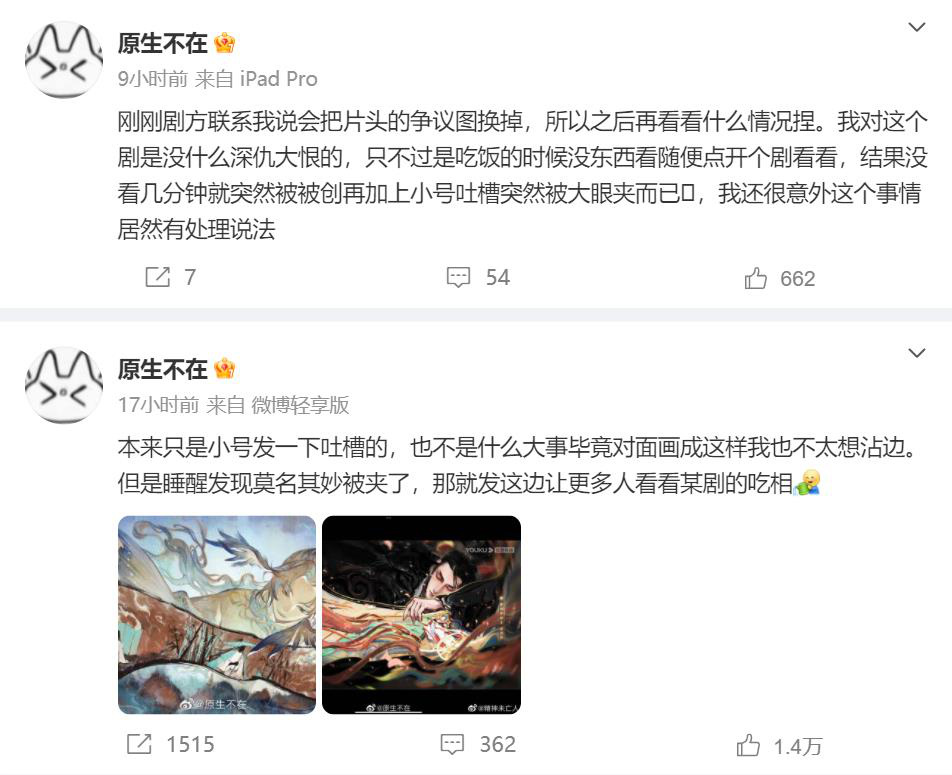 除被曝抄袭其他影视剧外,还被网友“原生不在”放锤,质疑该剧抄袭自己的原创画作。据“原生不在”透露,目前《长月烬明》方已对此事与她进行了沟通,“刚刚剧方联系我说会把片头的争议图换掉。”