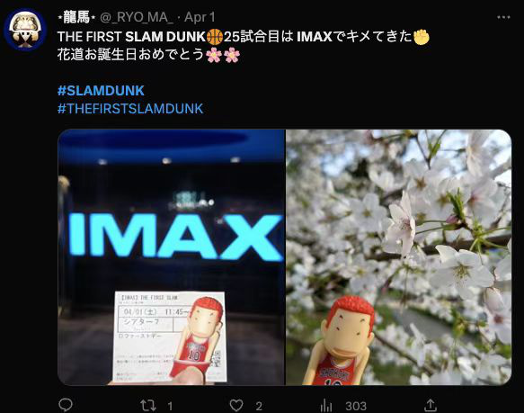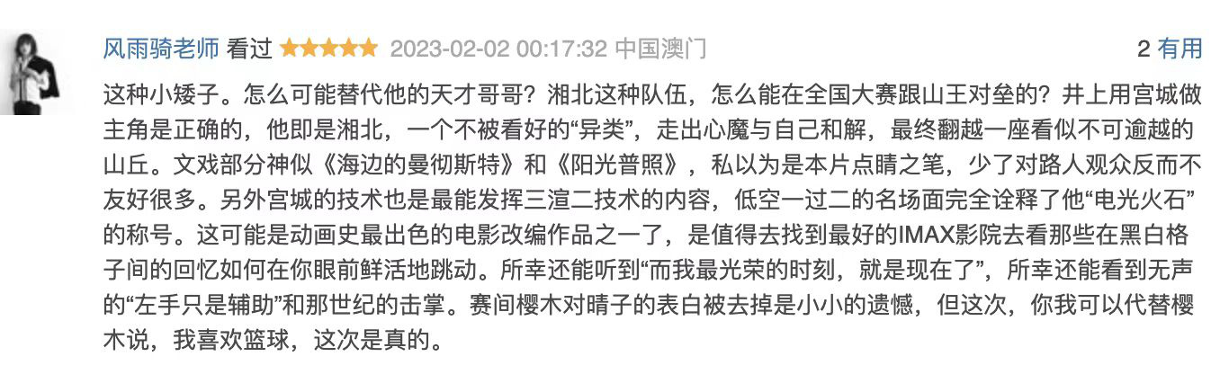 有网友为提前看片千里跋涉,@少年如此多娇lol 兴奋记录:“澳门上映,飞过去看IMAX,值得!看完太激动了!好燃。又想把动画片刷一遍!电影看完很多人都不愿意离开,感觉太快了。再来2小时!”影迷@风雨骑老师 盛赞:“这可能是动画史上最出色的电影改编作品之一,值得去找到最好的IMAX影院去看那些在黑白格子间的回忆如何在你眼前鲜活地跳动。”日本IMAX场观众@kureeisa 评价:“IMAX不只是音效震撼,银幕尺寸、画面亮度、色彩都超级棒!在大银幕上看到湘北球队不由自主就哭了出来!”