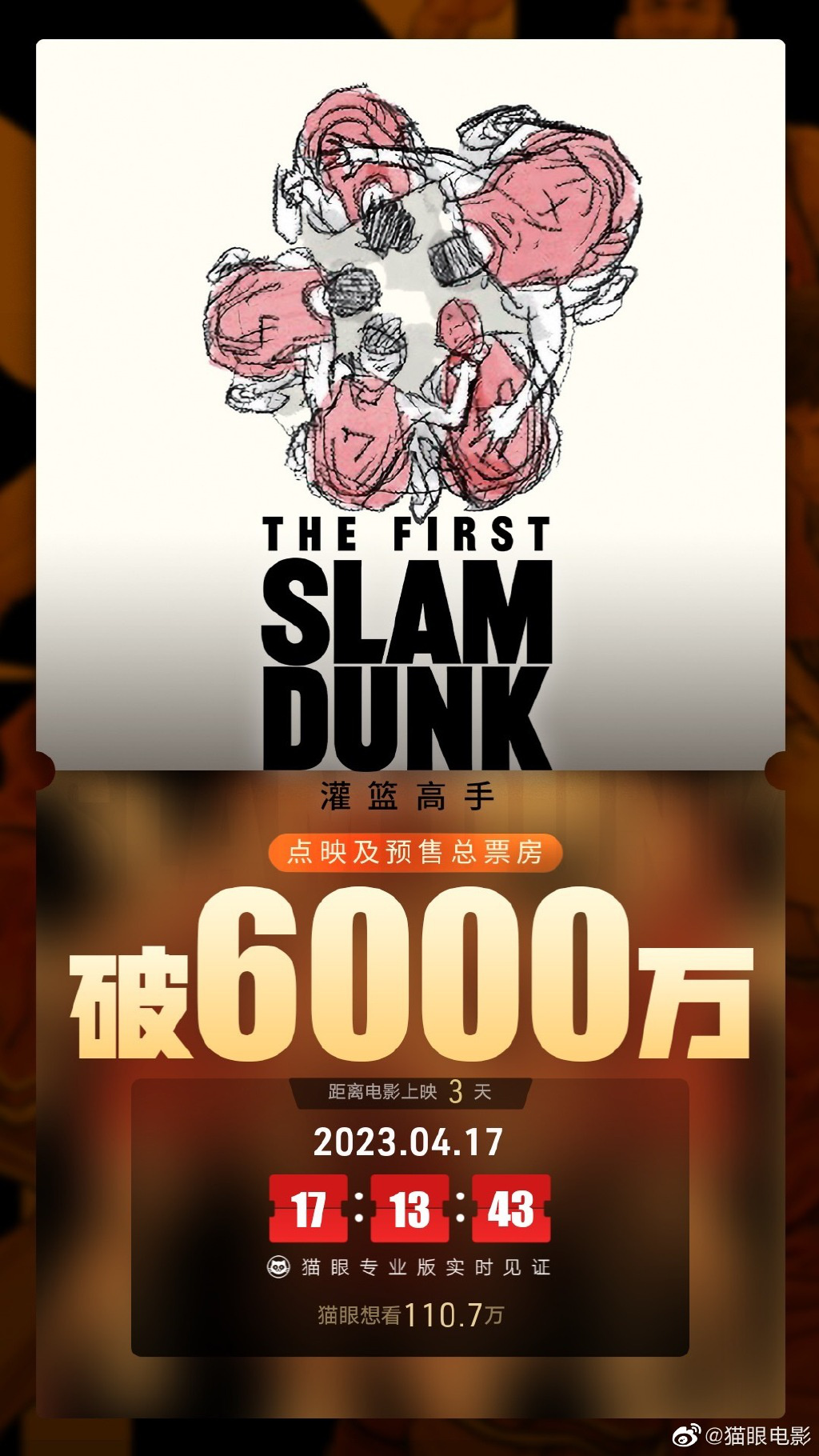 据猫眼专业版数据显示,截至4月17日17时13分,电影《灌篮高手》映前3天 ,点映及预售总票房破6000万,想看人数110.7万。