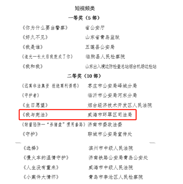 近日,山东省委政法委举办的第四届“平安山东”“法治山东”微电影、微视频、微动漫比赛暨优秀政法文化作品征集评选活动获奖名单揭晓,全省共有124部分获各类奖项。其中,威海环翠区司法局原创作品《我与宪法》荣获短视频类二等奖!