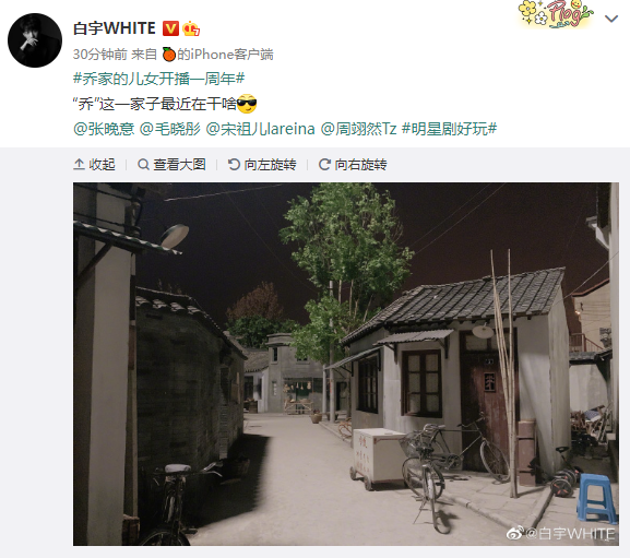 8月17日,白宇在微博晒出晒《乔家的儿女》片场空镜图庆祝该剧开播一周年,并艾特了饰演自己弟弟妹妹的张晚意、毛晓彤、宋祖儿、周翊然,随后宋祖儿、毛晓彤等也晒照与大哥互动,氛围温馨有爱。