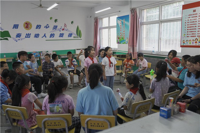 胭脂河畔,铁贯山下,马兰歌声回响不息。为期一周的美育支教过程中,支教团不仅给孩子们带来了美育公开课,还邀请学生一同筹办“把我唱给你听”主题歌会,孩子们在这里放声高歌,与山水和鸣,与乡土齐奏;师生组建“小星星合唱团”,练唱《在太行山上》,让孩子们在合唱中体验音乐之美;此外,支教团还义务为马兰村村民放映露天电影,将电影之光带入乡间地头。