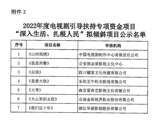 近日,国家广播电视总局发布关于2022年度电视剧引导扶持专项资金项目评审结果公示的通知。公示中包括《县委大院》《大考》《灿烂!灿烂》等7个拟支持项目、《后浪》《大山里的女校》《我们这十年》等7个“深入生活,扎根人民”拟倾斜项目。