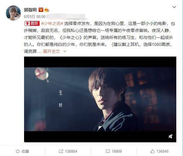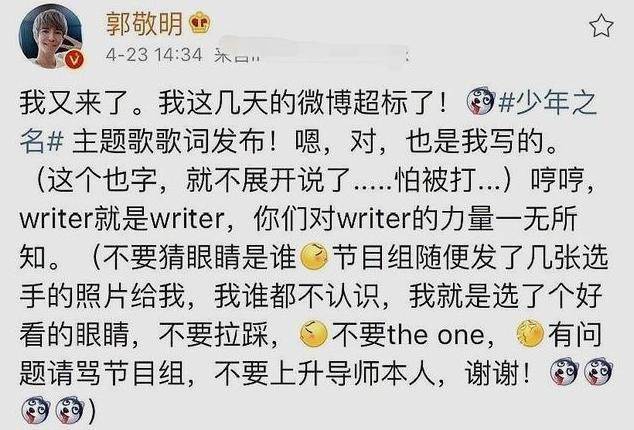 节目自开拍以来,郭敬明的社交账号营业次数实在太频繁,保持在一天一更或三天一更的频率,偶尔一星期一更,基本上都是在为节目做宣传,为大家报进度报选手,每个动态都是一篇小作文。看来郭敬明对自己的导师身份很负责,对节目也很上心,从拍的MV和平时他和选手们的相处来看,他是真心实意地关心选手,希望他们能够追梦成功。