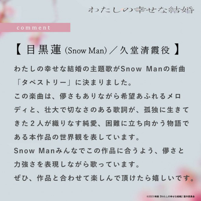 另一方面,被收录在Snow Man第八张单曲中的新歌《タペストリー》(编织/Tapestry)被选为电影《我的幸福婚约》主题曲,这首为影片量身打造的歌曲,描述了久堂清霞和斋森美世间淡淡而凄凉的爱情。