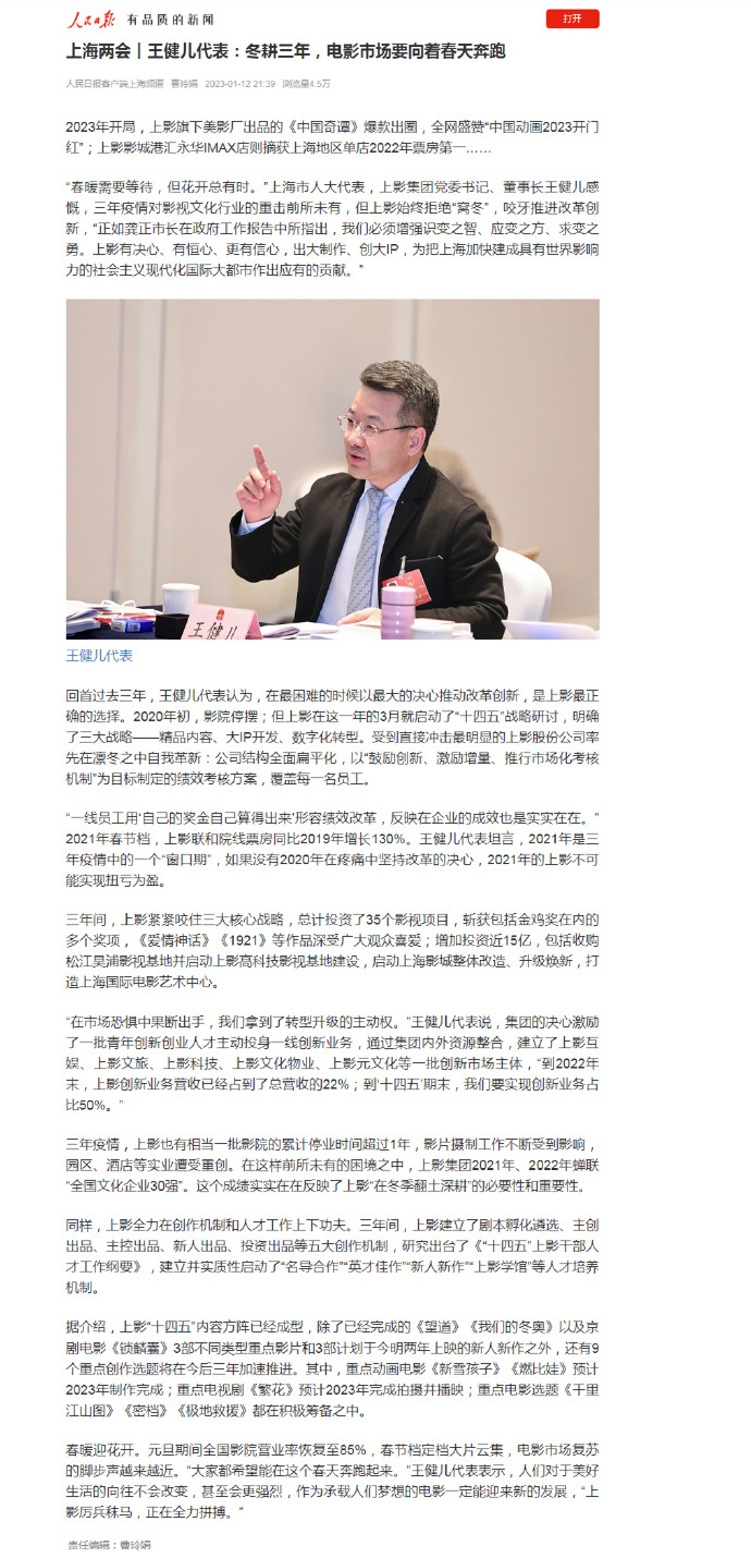 据《人民日报》消息,近日,上海市人大代表,上影集团党委书记、董事长王健儿参加上海两会时,介绍上影在三年疫情内的应变和改革,以及未来将推出的作品:重点动画电影《新雪孩子》《燃比娃》预计2023年制作完成;重点电视剧《繁花》预计2023年完成拍摄并播映;重点电影选题《千里江山图》《密档》《极地救援》都在积极筹备之中。