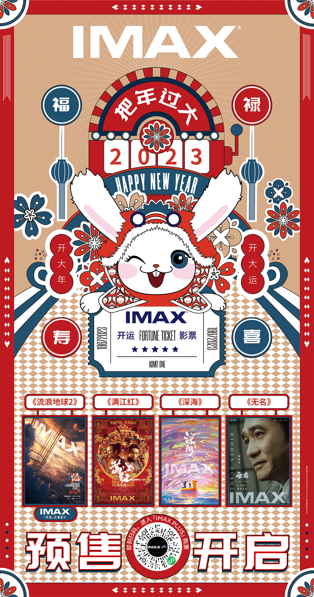 2023年的IMAX春节档主视觉以“把年过大”为主题,活泼灵动,寓意吉祥好运。主视觉海报中,发光的好运机器上“2023”和“把年过大”彰显新年的欢庆氛围,当好运机器转动起来,可爱灵动的瑞兔送上“开运影票”,预示着新年看IMAX就能开启全年好运。传统“红蓝”配色经现代设计风格的变幻后配上复古霓虹灯的设计,花团锦簇,使整个画面洋溢着复古电影院的氛围。