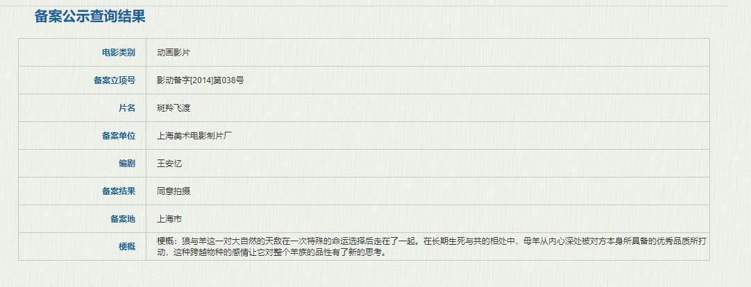 根据备案公示显示,动画长片《斑羚飞渡》由王安忆编剧,讲述狼与羊这对大自然的天敌在一次特殊命运选择后走在了一起。在长期生死与共的相处中,羊族对自身的品性有了新的思考。