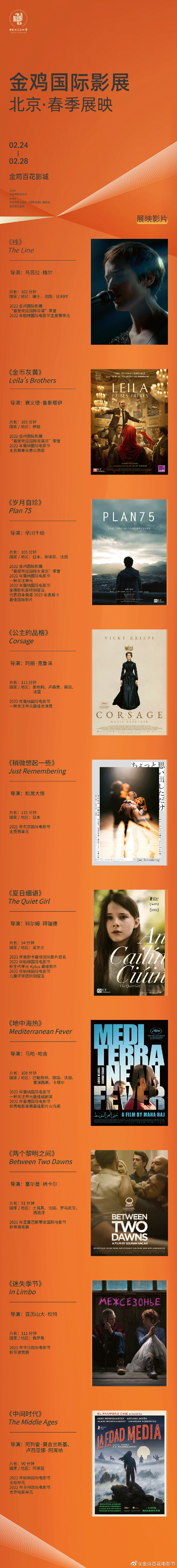 金鸡报春,共赏佳片!金鸡国际影展(北京)春季展映将于2月24日至28日在北京金鸡百花影城举行,期间将展映《线》、《金币灰黄》、《岁月自珍》、《公主的品格》、《稍微想起一些》、《夏日细语》、《地中海热》、《两个黎明之间》、《迷失季节》和《中间时代》十部精选佳片。