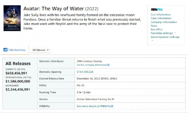 如今《阿凡达:水之道》截至上周末全球票房累计22.44亿美元。其中北美周末收612万美元,累计6.58亿,超过《侏罗纪世界》成为北美影史第九,北美之外收1070万,累计15.86亿。《泰坦尼克号》截至上周末全球票房累计22.43亿。其中北美上周末收229万,累计6.72亿,北美之外收800万,累计15.7亿。