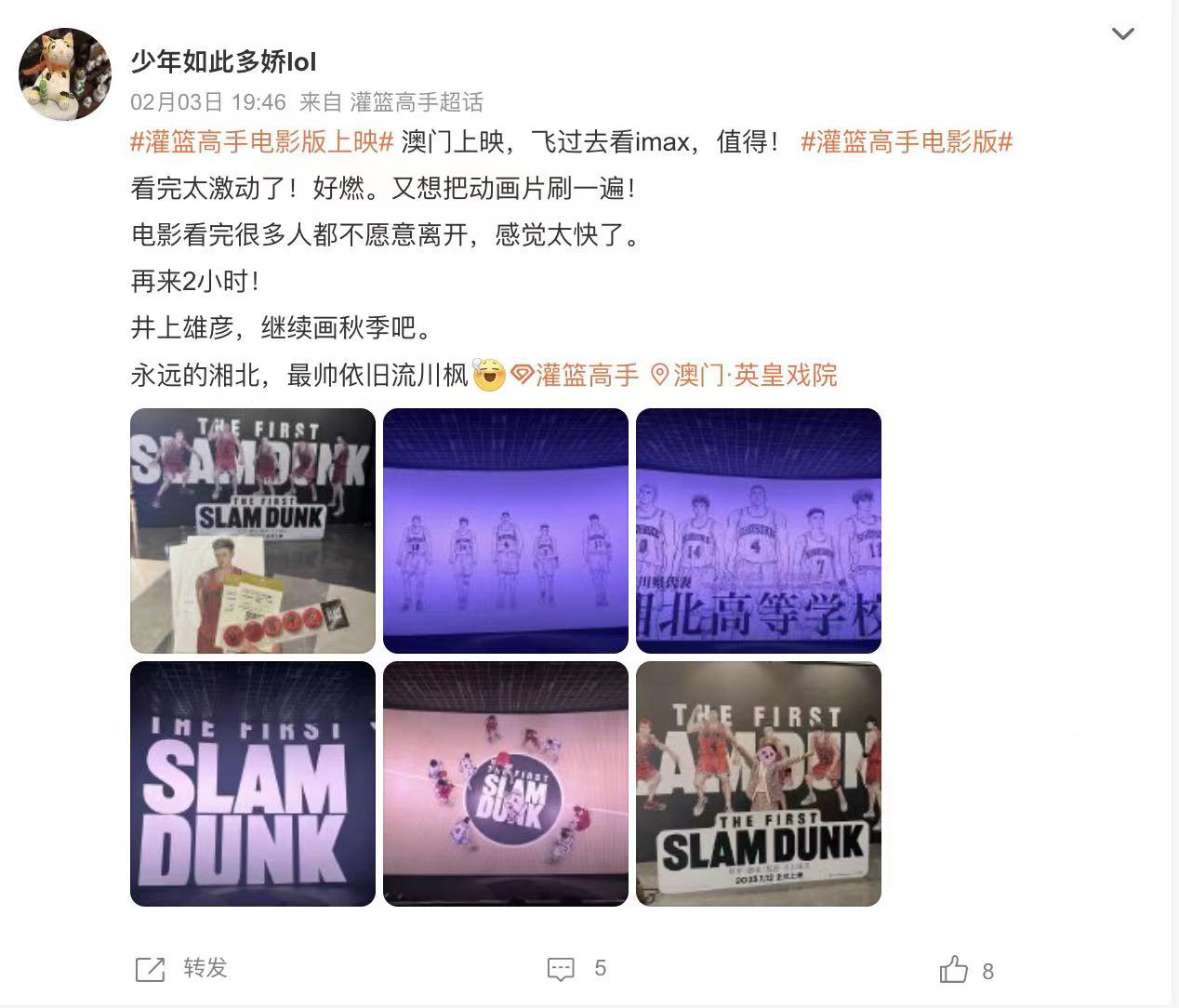 有网友为提前看片千里跋涉,@少年如此多娇lol 兴奋记录:“澳门上映,飞过去看IMAX,值得!看完太激动了!好燃。又想把动画片刷一遍!电影看完很多人都不愿意离开,感觉太快了。再来2小时!”影迷@风雨骑老师 盛赞:“这可能是动画史上最出色的电影改编作品之一,值得去找到最好的IMAX影院去看那些在黑白格子间的回忆如何在你眼前鲜活地跳动。”日本IMAX场观众@kureeisa 评价:“IMAX不只是音效震撼,银幕尺寸、画面亮度、色彩都超级棒!在大银幕上看到湘北球队不由自主就哭了出来!”