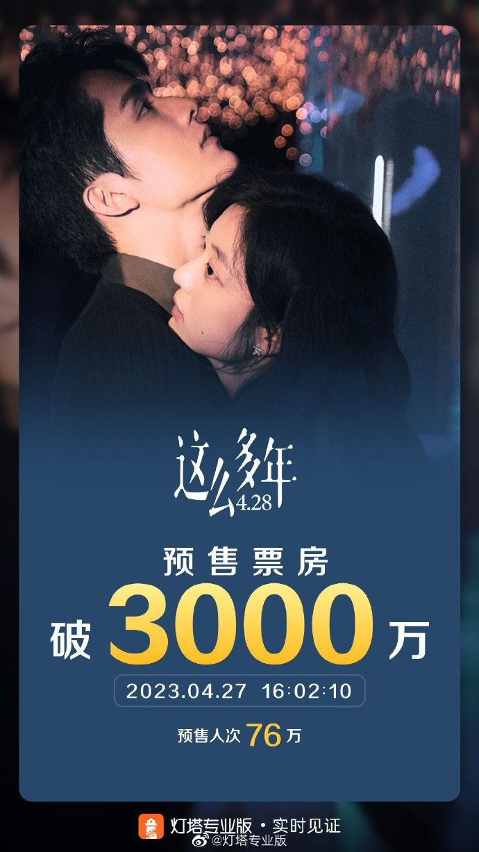 据灯塔专业版实时数据显示,截至4月27日16时,电影《这么多年》预售总票房突破3000万,距离影片上映倒计时1天。