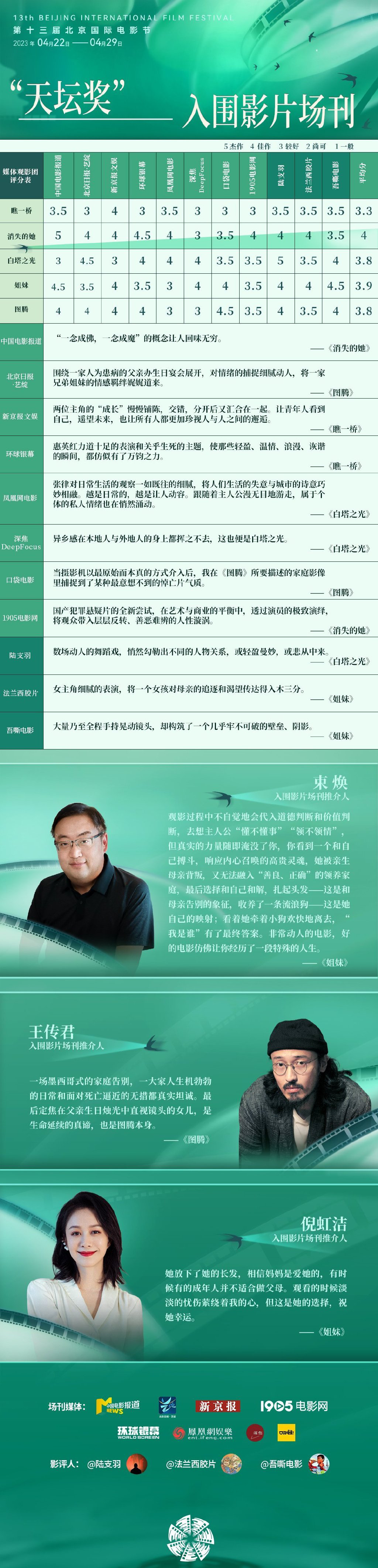 第十三届北京国际电影节发布“天坛奖”入围影片首张评分表,媒体观影团及“天坛奖”入围影片场刊推介人束焕、王传君、倪虹洁评分公开。