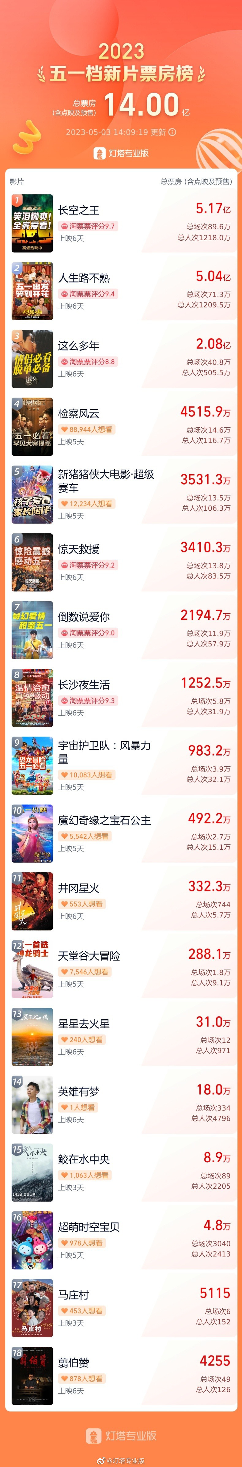 根据灯塔专业版数据显示,截至5月3日14时09分,2023五一档新片总票房(含点映及预售)已达14亿。电影《长空之王》展现出“王”的气势,以5.17亿的票房成绩稳居榜首,强势领跑。《人生路不熟》《这么多年》位居第二、第三位。