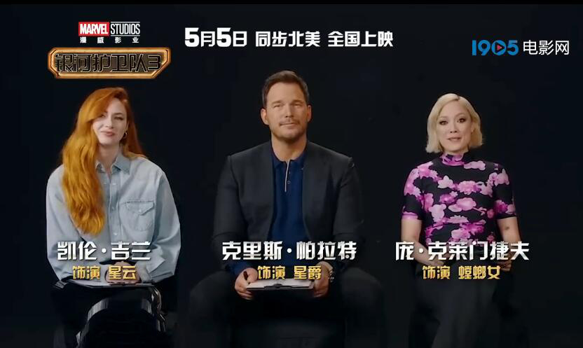 5月4日,电影《银河护卫队3》发布“互换同学录”中文版预告片。“星云”凯伦·吉兰、“星爵”克里斯·帕拉特、“螳螂女”庞·克莱门捷夫现场填写同学录。