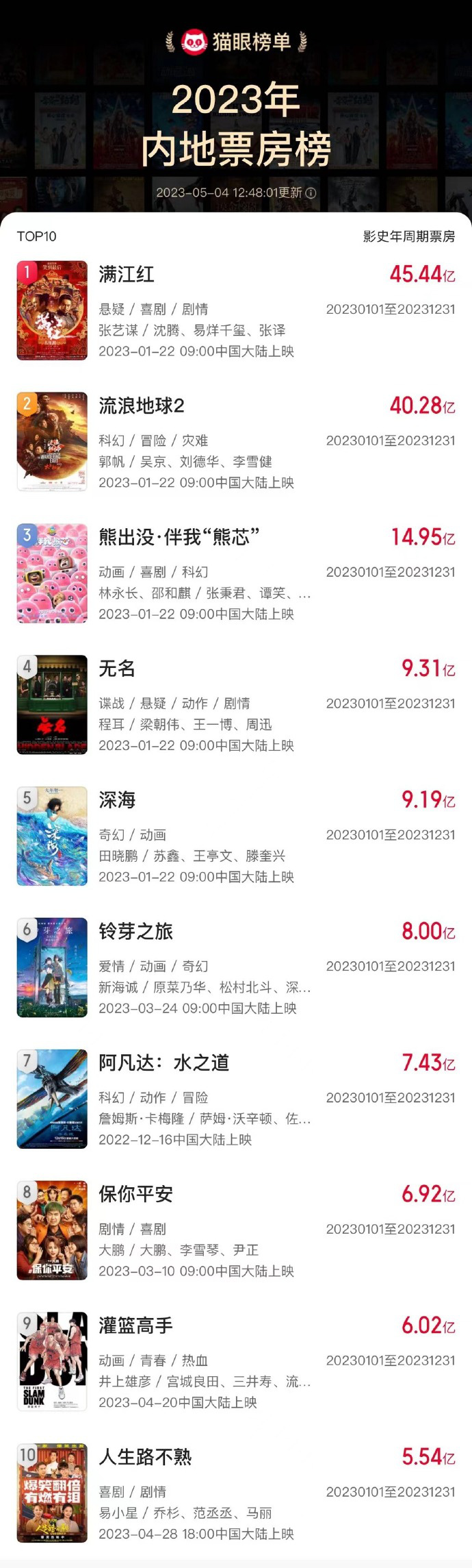 据猫眼专业版数据显示,电影《人生路不熟》上映7天,总票房(含预售)突破5.54亿,超过电影《交换人生》(3.93亿),进入2023年电影票房总榜前十。