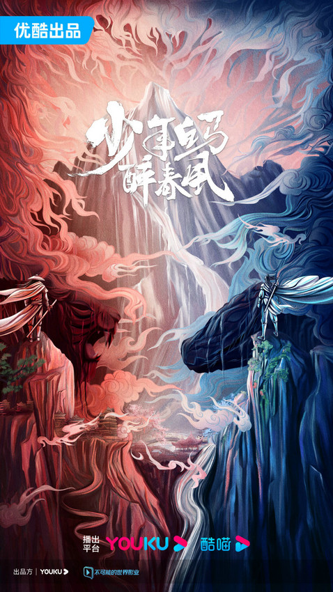 ⾼燃武侠强调⽓势恢宏、热⾎沸腾、激情震撼。在影视化的《少年白马醉春风》概念海报中,画面整体风格以二次元为主:人物面朝风云莫测的山巅,丰富的流动笔触体现江湖洪流动荡。在这样的背景下少年的初成即将锋芒终露。蓝与红暗示着命运不同的双生少年底色,也寓意着纷繁的江湖之行。他们因为截然不同的命运遭遇,最终将面对的是一步之差少年陌路,还是大道朝天的兄弟同行?江湖与侠者的宿命感在海报画面中呼之欲出。