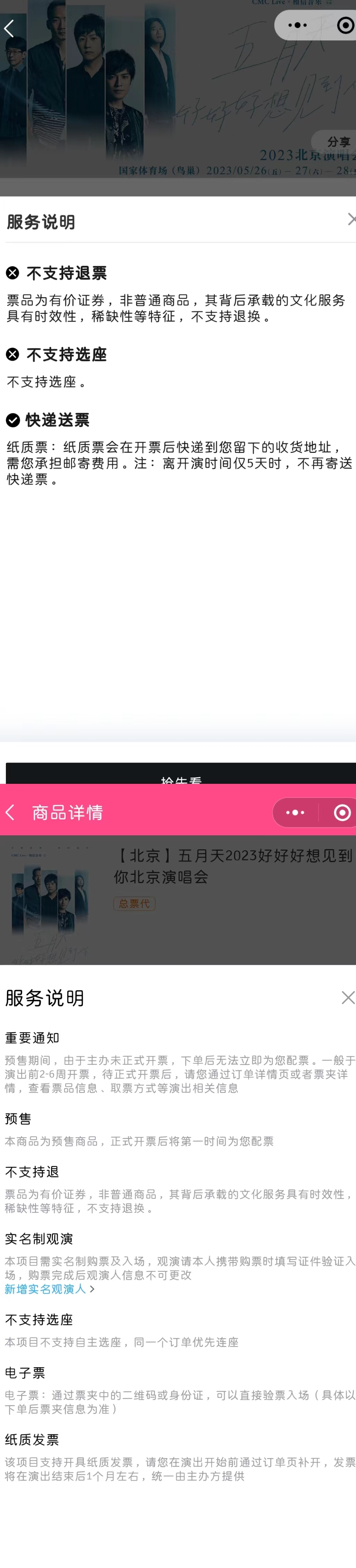 五月天的两场演唱会分别将在5月9日上午11点和下午17点在纷玩岛和大麦开启预售,在票务平台大麦中,记者发现该场演唱会服务说明中表示,该演唱会需要实名制购票及入场,观演要求本人携带购票时填写的证件验证入场,且购票完成后观演人信息不可更改,入场采取电子票形式,相较于纸质票更不易被转让。但票务平台纷玩岛的服务说明则显示该场演唱会为纸质票,通过快递邮寄送票到指定地址,入场时携带纸质门票验证入场,并说明一张门票对应一个身份证件。