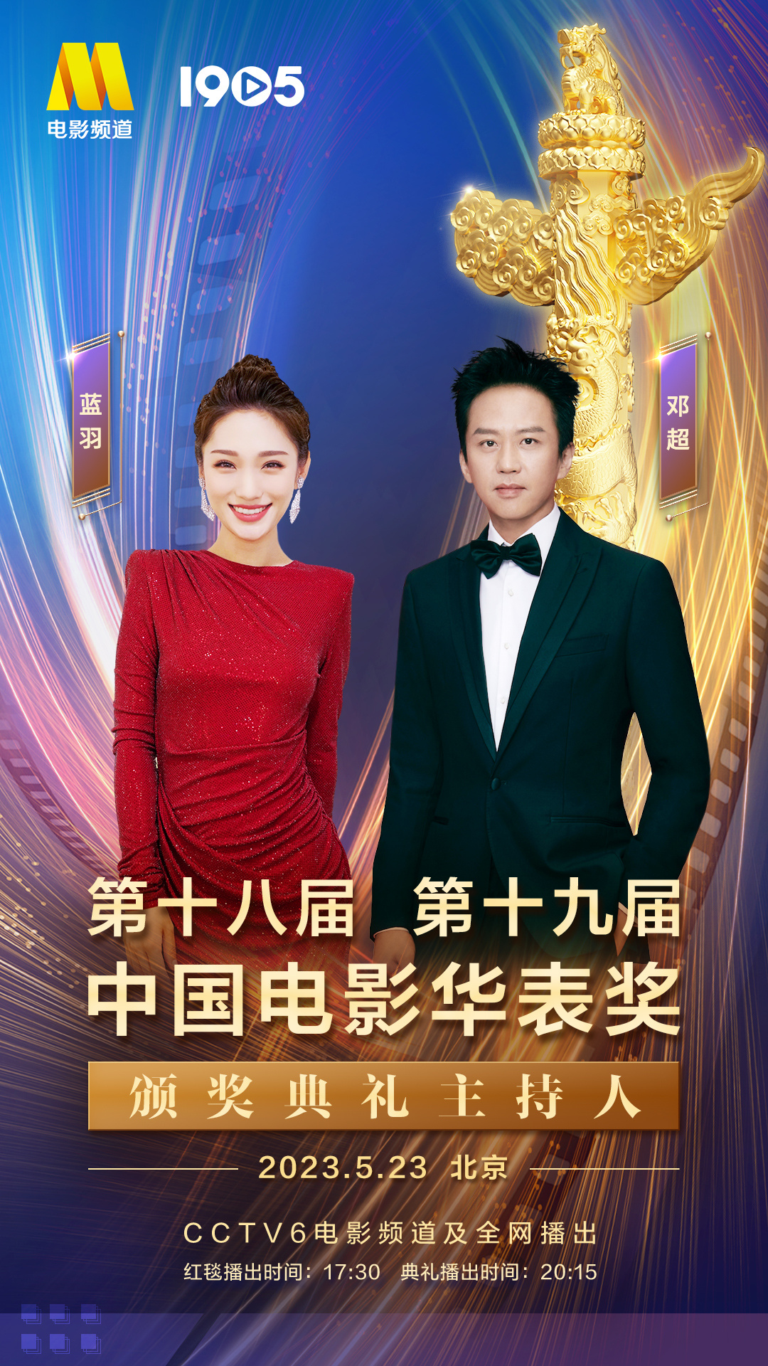 第十八届、第十九届中国电影华表奖颁奖典礼主持阵容公布,电影频道主持人蓝羽与电影人邓超共同主持!再度搭档同台主持,与广大电影界同仁共同见证华表荣誉时刻。