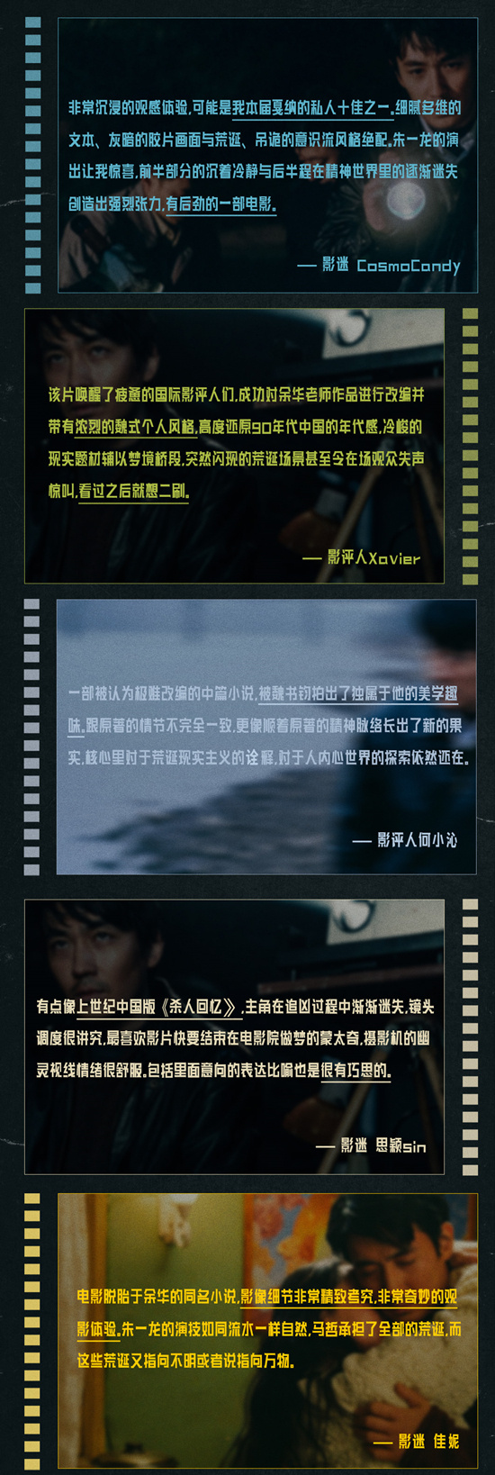 影迷CosmoCandy评价该片是“本届戛纳的私人十佳之一”:“细腻多维的文本、灰暗的胶片画面与荒诞、吊诡的意识流风格绝配。朱一龙的演出让我惊喜,前半部分的沉着冷静与后半程在精神世界里的逐渐迷失创造出强烈张力,是一部有后劲的电影”。