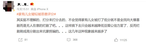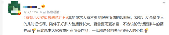 对此,有网友表示,《家有儿女》作为众多观众的童年记忆,其作品质量有目共睹,如今却沦为饭圈争斗的牺牲品。某些群体的恶性打分,对一部作品来说是莫大的悲哀。