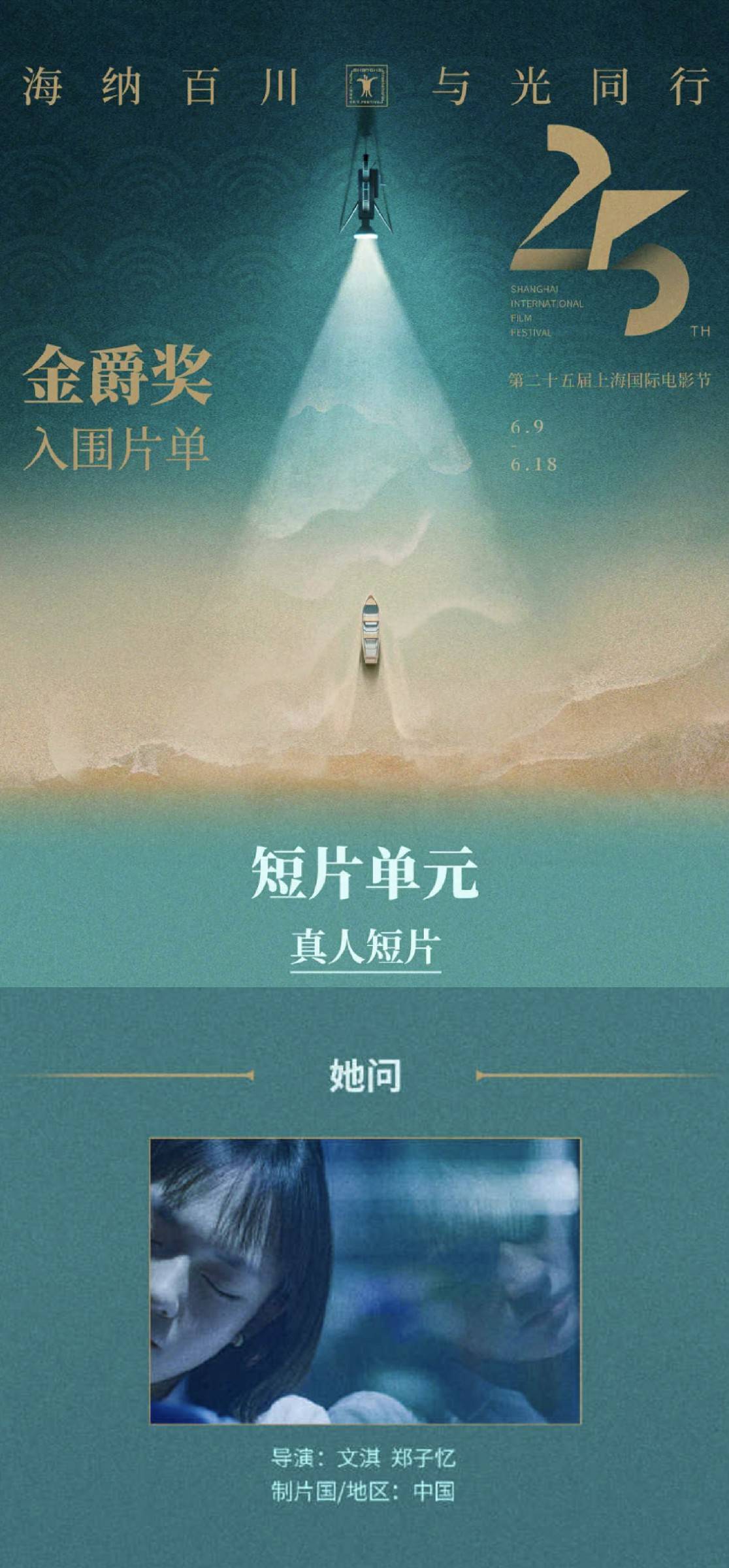 凭借在电影《嘉年华》《血观音》中的精彩演绎,而被观众认识的19岁女演员文淇,又解锁了新身份——导演。记者注意到,第25届上海国际电影节金爵奖短片竞赛单元中,由文淇、郑子忆执导,文淇主演的短片《她问》赫然亮相。