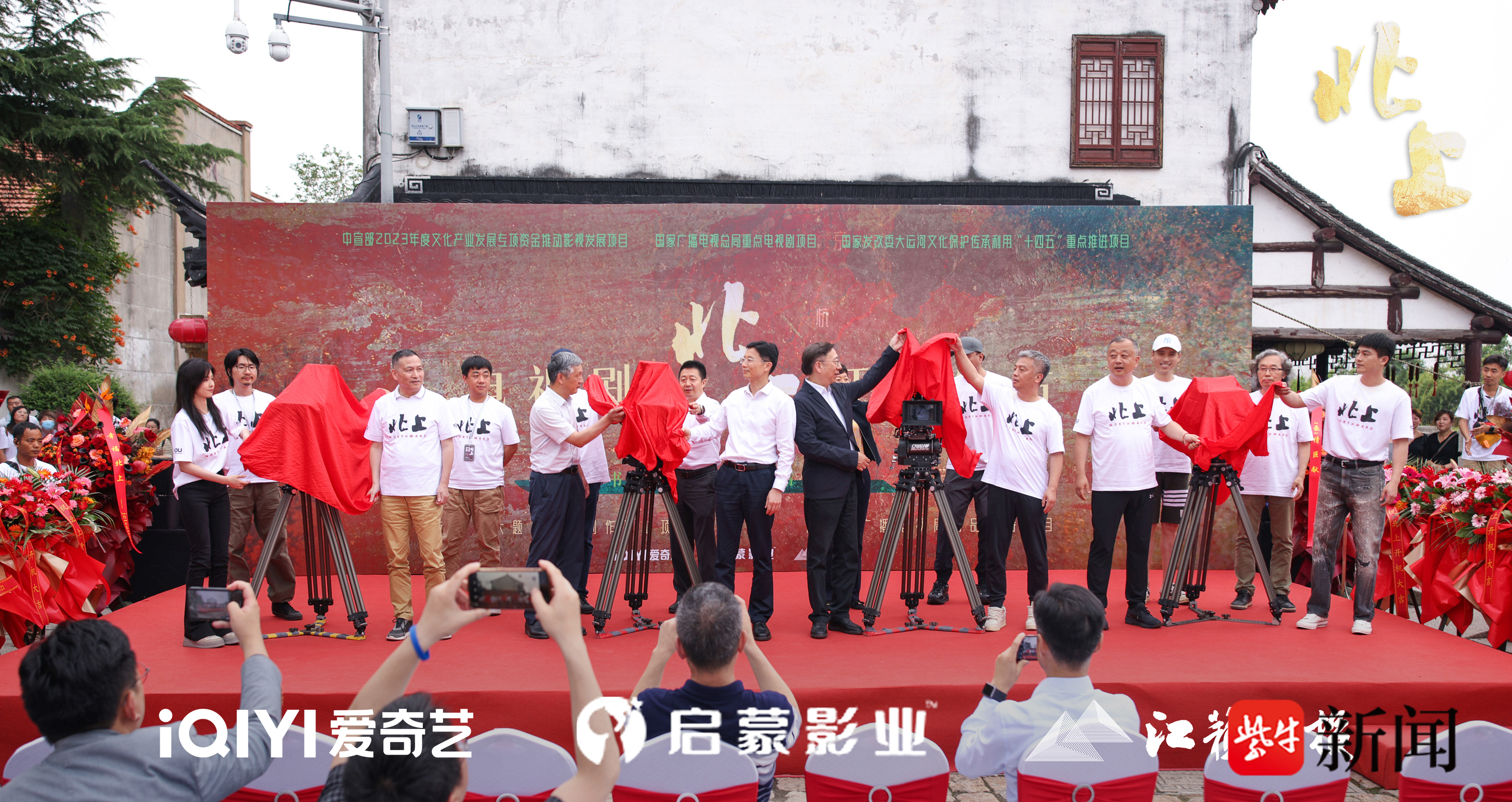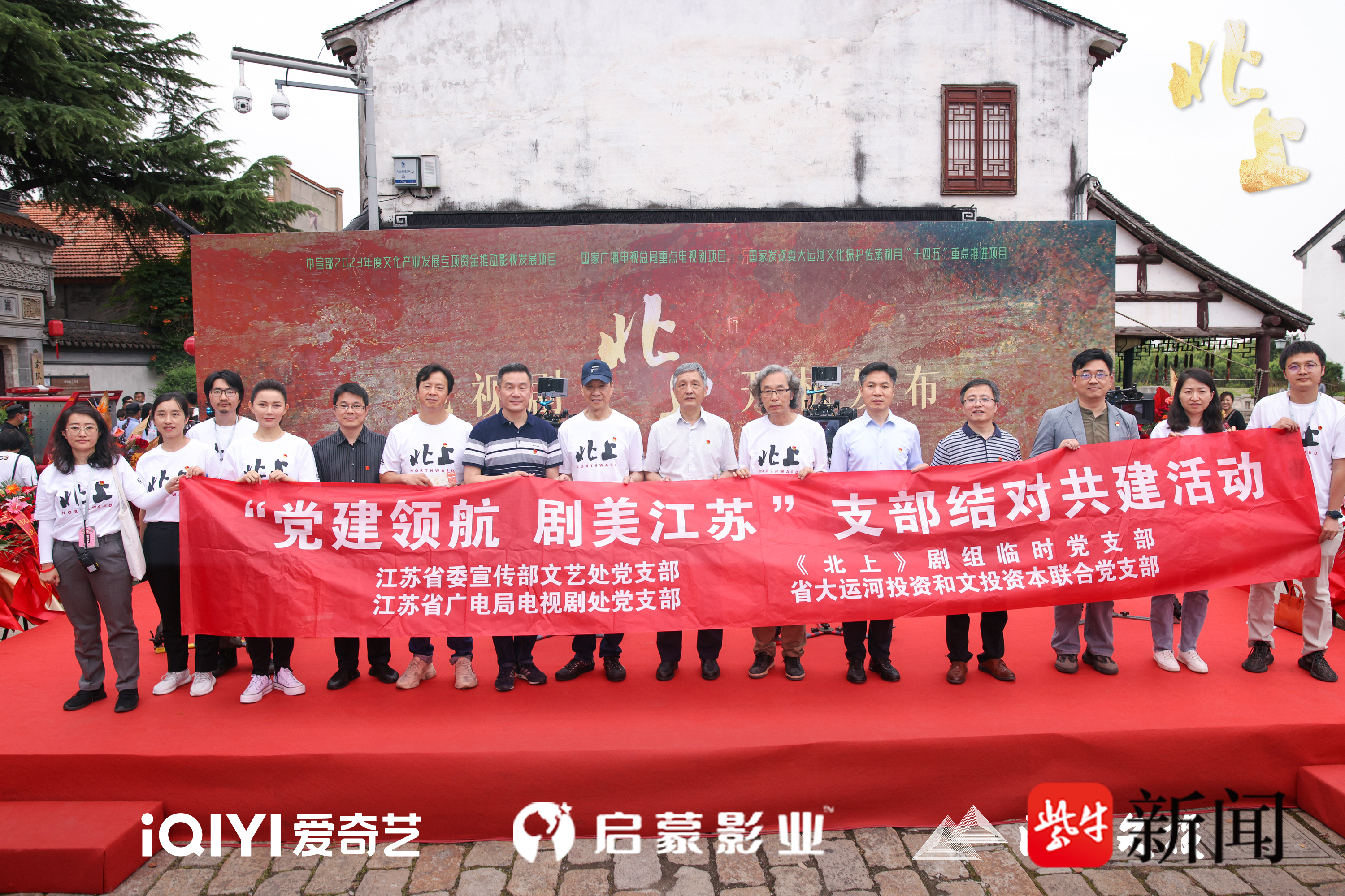 开机发布现场,《北上》剧组成立了临时党支部,充分发挥党员精神和模范带头作用,鼓舞人心振奋士气。江苏省委宣传部、江苏省广播电视局相关领导,江苏文投、爱奇艺、启蒙影业的主要负责人莅临现场并致辞发言,要求剧组主创在拍摄制作过程中坚守人民立场,坚持守正创新,坚持弘扬正道,“用情用力讲好发生在江苏的中国故事”,期许创作团队从大运河涌动的民族文化浪波中饱蘸墨彩,抒写生生不息的人民史诗,将《北上》打造为能够深度满足人民文化需求,增强人民精神力量的精品力作。
