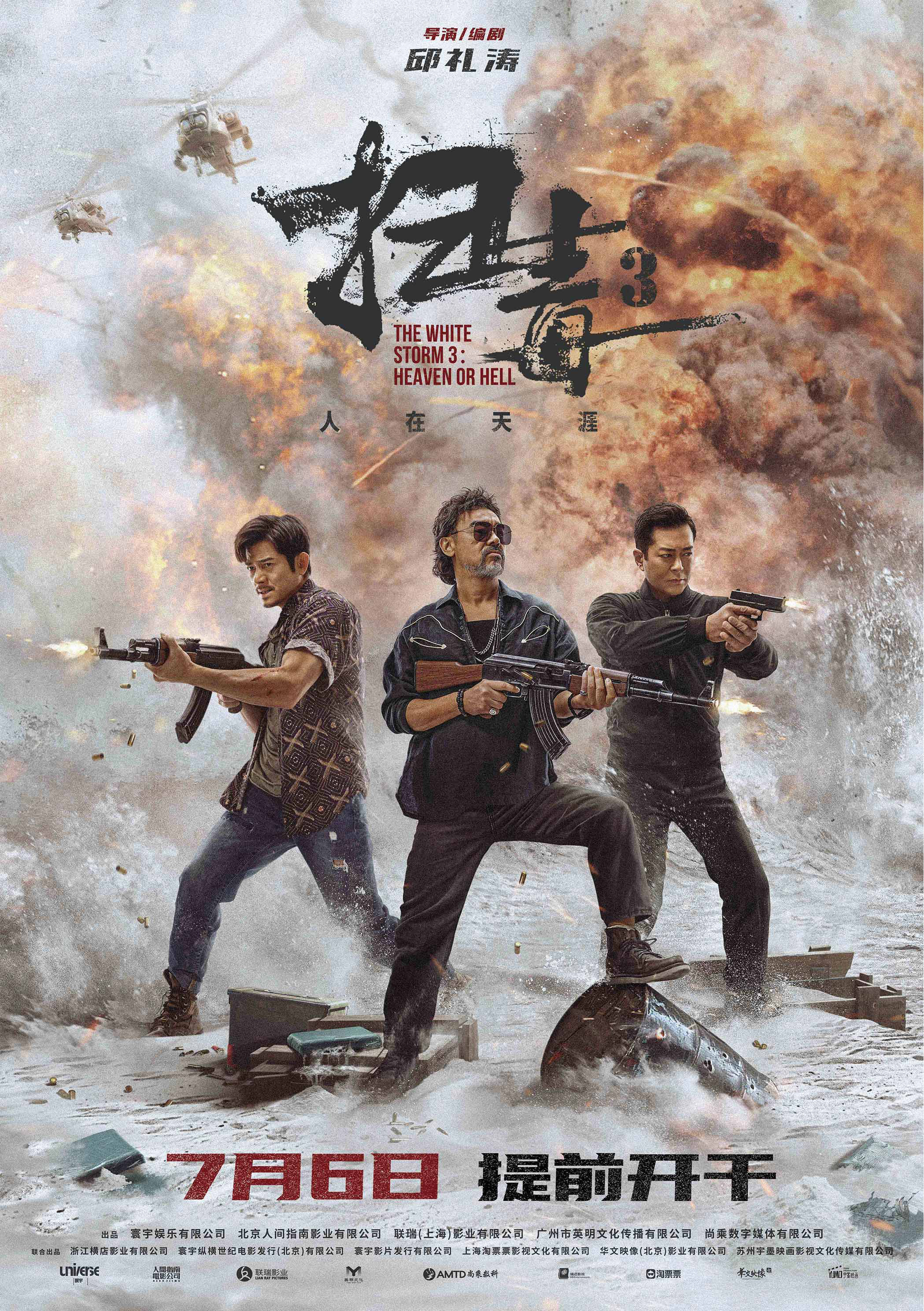 由邱礼涛执导,郭富城、刘青云、古天乐领衔主演的动作犯罪电影《扫毒3:人在天涯》日前发布“三雄联手”版海报,正式宣布提档至7月6日。身处白粉沙漠中的三人手持武器朝三方激烈开火,身后炮火连天,纷飞的白粉几乎要将三人吞噬,震撼刺激的动作感扑面而来。