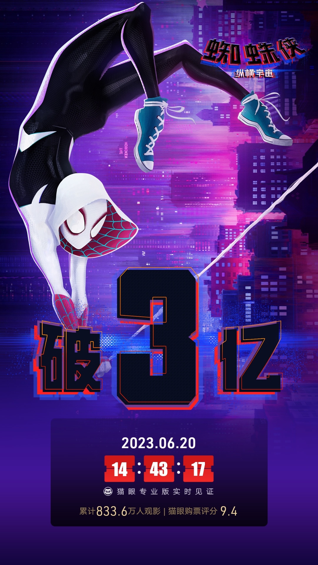 登顶《帝国》杂志“影史最佳动画”、奥斯卡最佳动画长片《蜘蛛侠:平行宇宙》全新续作《蜘蛛侠:纵横宇宙》正在全国热映中,内地票房已突破3亿人民币。超280个蜘蛛侠登场、潮酷视觉画风以及超乎想像的大银幕视听享受,获得全球观众好评不断。目前全球票房已斩获4.9亿美元,大幅超越前作,北美地区豪取2.84亿美元升至北美年度票房榜第三名,海外各国票房大爆,已成为目前索尼影业票房最高的动画电影。