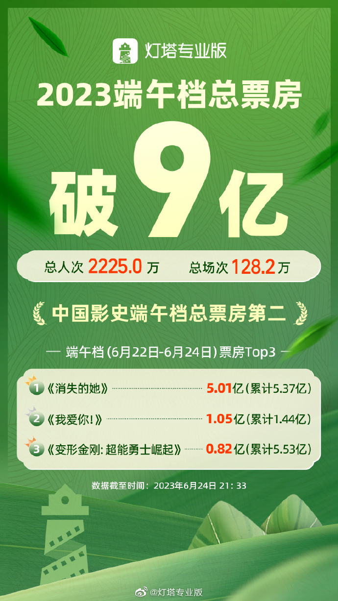 根据灯塔专业版数据,截至6月24日21时33分,2023年端午档(6月22日-6月24日)总票房破9亿,观影总人次2225.0万,总场次128.2万场,位列中国影史端午档总票房第二位。