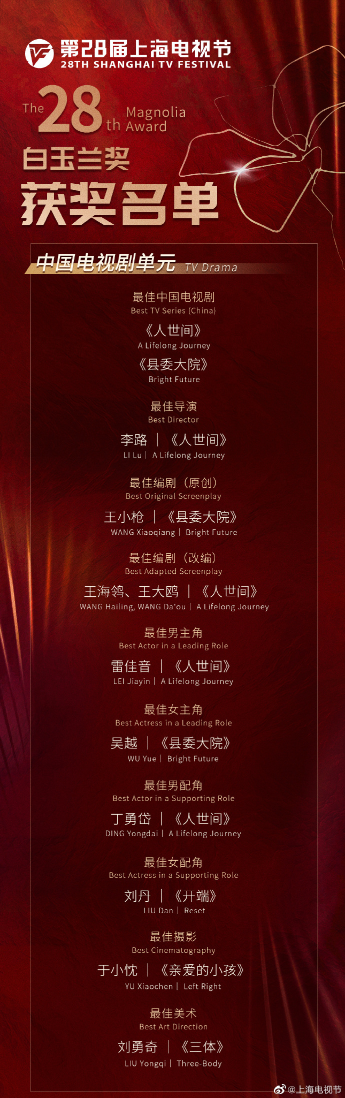 6月23日晚,第28届上海电视节落下帷幕,白玉兰奖悉数揭晓。最终,口碑佳作《人世间》《县委大院》夺得最佳中国电视剧;雷佳音、吴越也凭借在这两部电视剧中的精彩表现分获最佳男女主角。