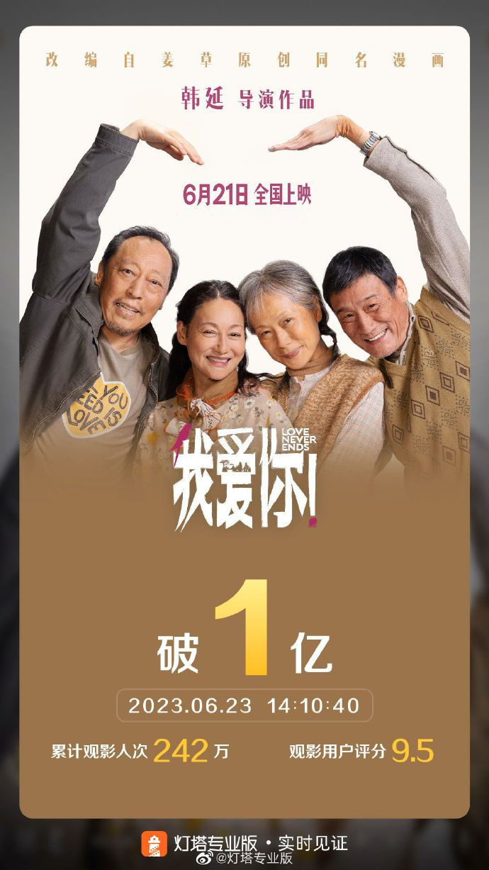 位列2023端午档票房榜第二位的《我爱你!》,由韩延执导、倪大红、惠英红、梁家辉、叶童主演,聚焦老年爱情故事。影片6月21日上映,截至6月22日14时10分,累计总票房破亿,打破过去三年端午档爱情片单日票房、档期票房等纪录,目前档期内票房8460万,还未破亿。