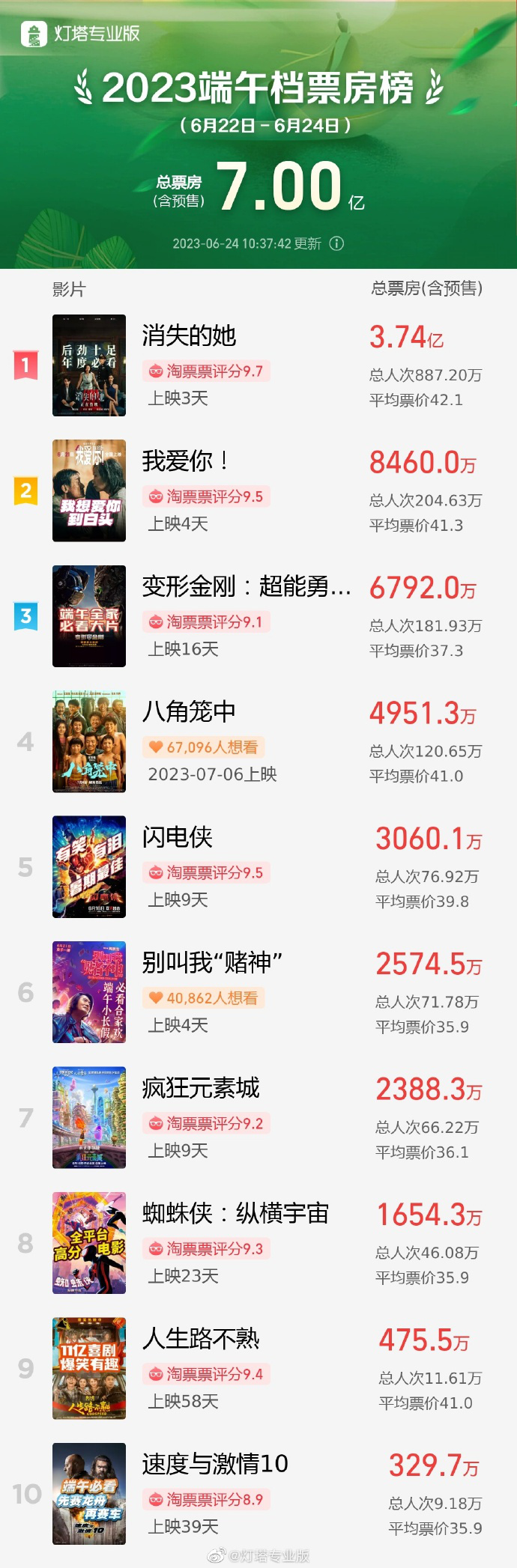 据灯塔数据显示,截至6月24日10时37分,2023年端午档总票房破7亿。《消失的她》《我爱你!》《变形金刚:超能勇士崛起》分别以3.74亿、8460万、6792万的档期票房成绩,位列榜单前三甲。其中,朱一龙、倪妮、文咏珊主演的悬疑电影《消失的她》优势较大,已无悬念夺得2023端午档票房冠军。目前,电影大盘仍在持续增长中。