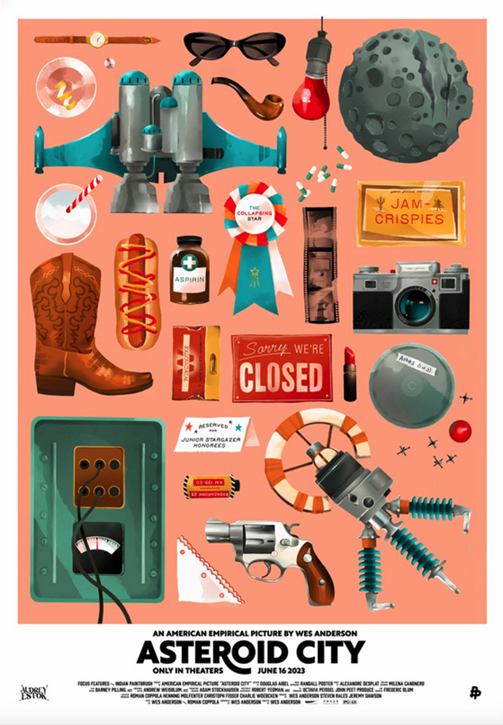 韦斯·安德森新片《小行星城》,发布了一组艺术海报。整组海报以影片道具、人物服装为设计主题,手绘为创作手段。马卡龙的配色,显得非常活泼有趣。