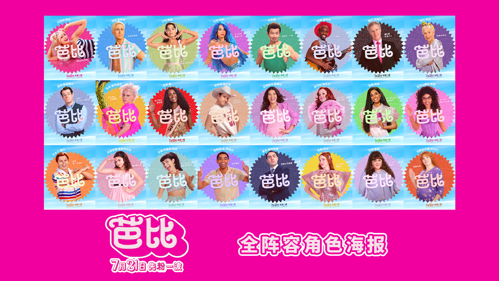 由华纳兄弟影片公司出品的真人电影《芭比》将于7月21日登陆全国影院与北美同步上映,影片震撼发布24张多巴胺风格角色海报,超多芭比和超多肯组团亮相!百变芭比Style令人大开眼界,美出无限可能,完美男友肯也是帅得各具特色,更有身份成谜的人类角色引爆无限遐想!缤纷一夏的芭比狂欢即将开启,7月21日一起来影院先粉一波!