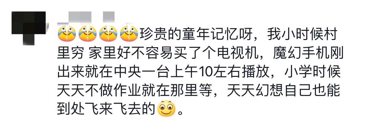 一名网友称《魔幻手机》是自己珍贵的童年记忆,当年家里好不容易买了电视机,小学时天天守在电视机前等待播出,“天天幻想自己也能到处飞来飞去”。