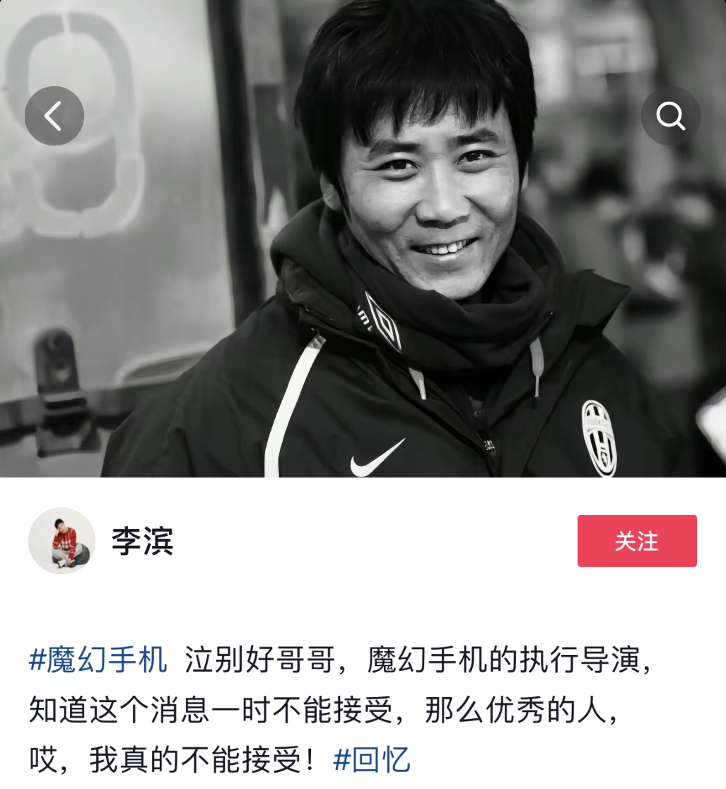 电视剧《魔幻手机》的男主角、演员李滨得知噩耗后,在社交媒体发布图文悼念:“泣别好哥哥,魔幻手机的执行导演,知道这个消息一时不能接受,那么优秀的人。”