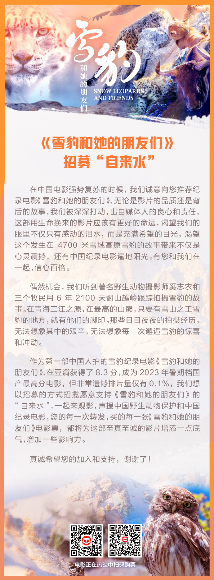 我们也希望,有更多“自来水”加入进来支持《雪豹和她的朋友们》!您的每一次转发,买的每一张《雪豹和她的朋友们》电影票,都将为这部至真至诚的影片增添一点底气!