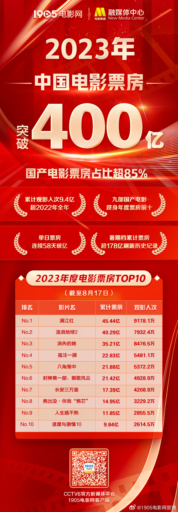 截至8月18日9时31分,2023年度中国电影票房突破400亿,其中国产电影票房占比超85%。累计观影人次达9.4亿超2022年全年,大盘单日票房连续58天破亿,暑期档票房超178亿,2023暑期档票房刷新影史纪录。