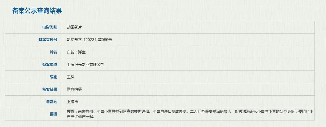 8月18日,国家电影局发布关于2023年7月上全国电影剧本(梗概)备案、立项公示的通知。由追光影业出品的动画电影《白蛇:浮生》正式立项。