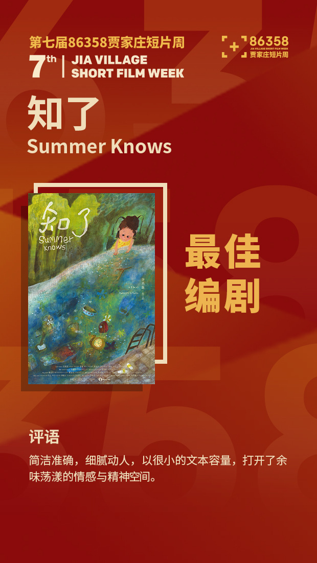 最佳编剧荣誉由《知了》获得,评委会认为该片简洁准确,细腻动人,以很小的文本容量,打开了余味荡漾的情感与精神空间。《知了》导演钟鸿鍦毕业于纽约大学Tisch学院电影制作专业,研究生毕业于南加州大学电影制作专业。创作聚焦于探索家庭关系与情感,执导短片《知了》入围第二十五届上海国际电影节金爵奖短片竞赛单元。钟鸿鍦希望通过像《知了》这部短片中的一个普通家庭的生活碎片,聚焦于家庭关系,探索人在幼儿时期对死亡的概念和对哀伤的反应。
