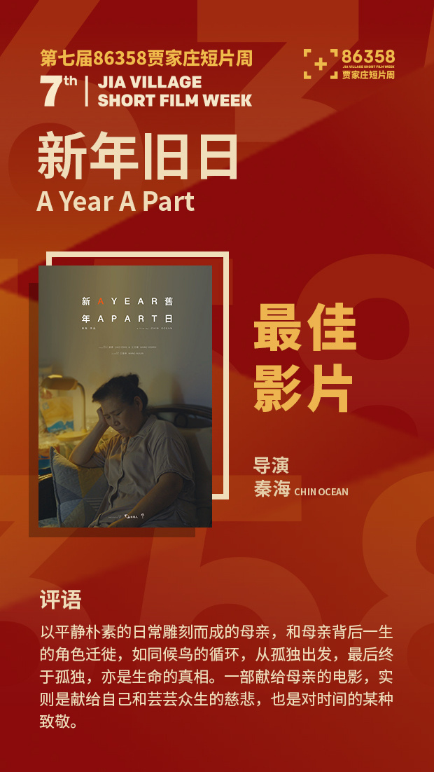 获得最佳影片的《新年旧日》由毕业于捷克布拉格电影学院的秦海导演,他曾以摄影指导身份参与电影《月光武士》、短片《防蚊贴片》《四十四只石狮子》等电影的制作。最佳影片荣誉是86358贾家庄短片周的最高荣誉,旨在表彰电影叙事技法娴熟,形式与风格上由创造性的优秀作品,该奖的奖励得到了广东南光影视器材有限公司的赞助。评委会认为《新年旧日》以平静朴素的日常雕刻而成的母亲,和母亲背后一生的角色迁徙,如同候鸟的循环,从孤独出发,最后终于孤独,亦是生命的真相。一部献给母亲的电影,实则是献给自己和芸芸众生的慈悲,也是对时间的某种致敬。