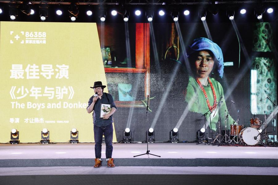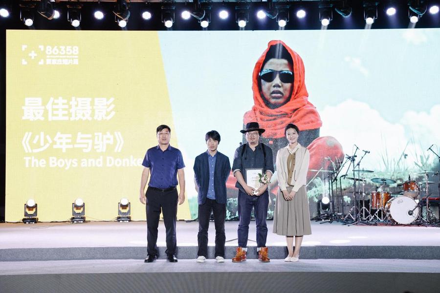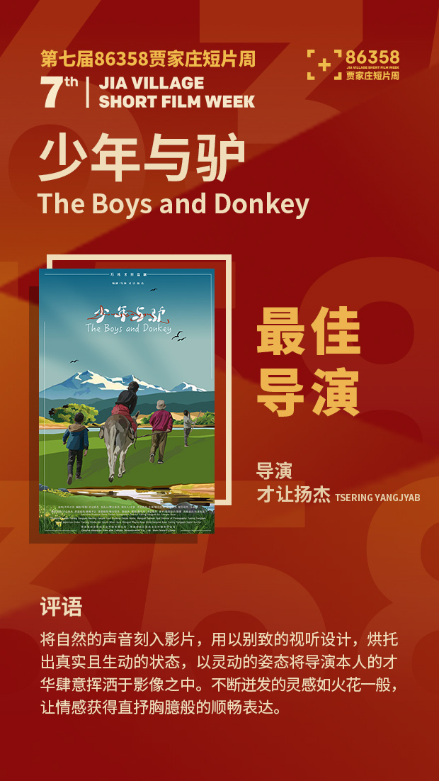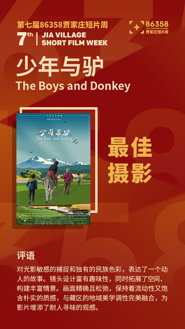 意外的是,电影短片《少年与驴》荣获了最佳导演和最佳摄影两项荣誉。该片导演才让扬杰1991年出生于青海牧区,2012年毕业于北京电影学院,曾在万玛才旦导演的多部影片中担任副摄影,在电影《小鹤卓玛》《迷路》两部长片中担任摄影指导,《少年与驴》为其短片处女作。《少年与驴》将自然的声音刻入影片,用以别致的视听设计,烘托出真实且生动的状态,以灵动的姿态将导演本人的才华肆意挥洒于影像之中。不断迸发的灵感如火花一般,让情感获得直抒胸臆般的顺畅表达。在荣誉典礼现场,才让扬杰致谢其恩师万玛才旦后,现场响起了长久的掌声,青年影人以此怀念曾经在第二届86358贾家庄短片周担任评委主席的万玛才旦导演。