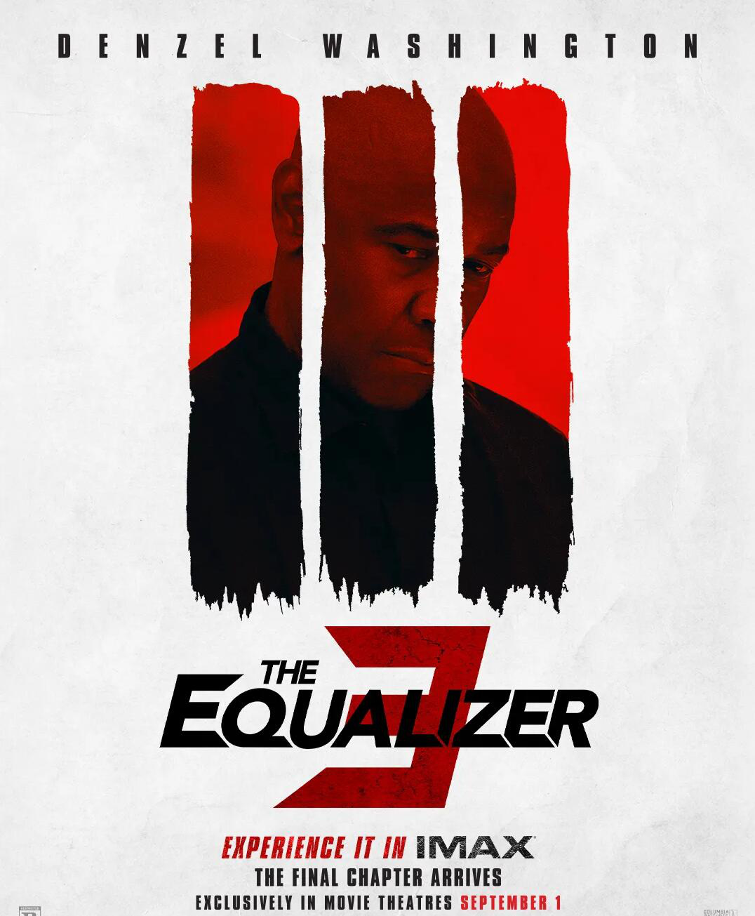 丹泽尔·华盛顿主演的动作片《伸冤人3》,公布了全新的海报。海报以极简创作为主。白色背景上,只有影片的信息和三道血红色的竖条纹。条纹中是丹泽尔·华盛顿充满愤怒的脸庞。