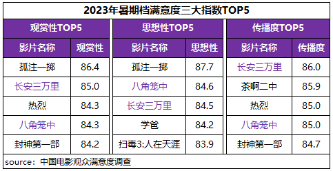 从单片满意度排序来看,反诈题材剧情片《孤注一掷》、历史题材动画影片《长安三万里》和根据真实事件改编的体育励志影片《八角笼中》居档期满意度排名前三甲;其中《孤注一掷》满意度居2023年调查40部影片的第三位,《长安三万里》居历史调查47部动画影片的第五位,《八角笼中》较王宝强导演的上一部作品《大闹天竺》高出4.9分。
