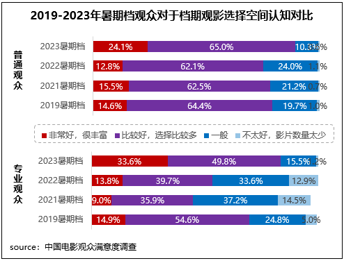 2023年7-8月新上映影片共80部,为近四年来同期最高值,满意度调查的13部影片涵盖剧情、动画、奇幻、悬疑、爱情、喜剧、动作等多元类型,给观众带来多样化的观影选择。调研数据显示,不同观众对于档期观影选择空间均给予了好评,普通观众、专业观众认为档期观影选择“非常好,很丰富”和“比较好,选择比较多”的占比合计分别达89.2%、83.4%,均为近五年同期最高。