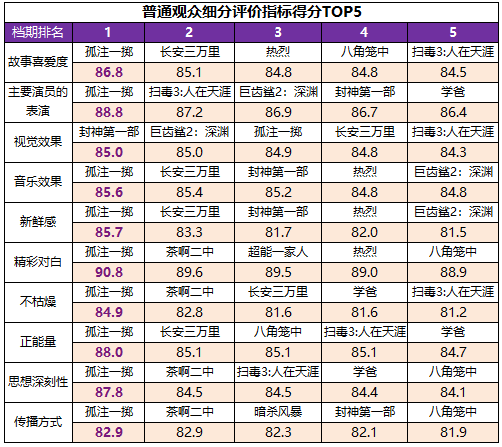 从细分维度来看,在普通观众评价体系中,《孤注一掷》有9项指标获得档期最高评分,其中精彩对白、主要演员的表演、故事喜爱度、正能量指标得分均超88分;《封神第一部》视觉效果得分居档期第一位,《茶啊二中》传播度与《孤注一掷》并列档期第一位。此外,《长安三万里》的故事喜爱度、音乐效果、新鲜感,《巨齿鲨2:深渊》的视觉效果和《扫毒3:人在天涯》的演员表演得分均居档期第二位;《热烈》的故事喜爱度、《八角笼中》的正能量得分居档期第三位。