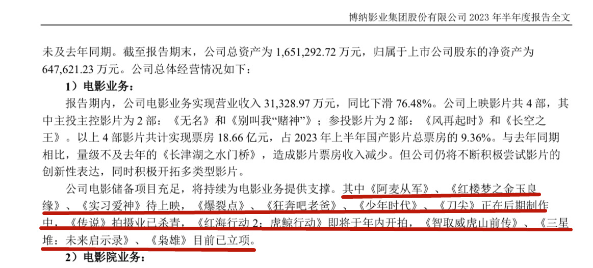 8月30日晚,博纳影业发布2023年半年财务报告。报告显示,2023年上半年公司总营收8.49亿元,同比去年同期下降42.31%,归属上市公司股东净利润为-2.64亿元,同比下滑212.22%。