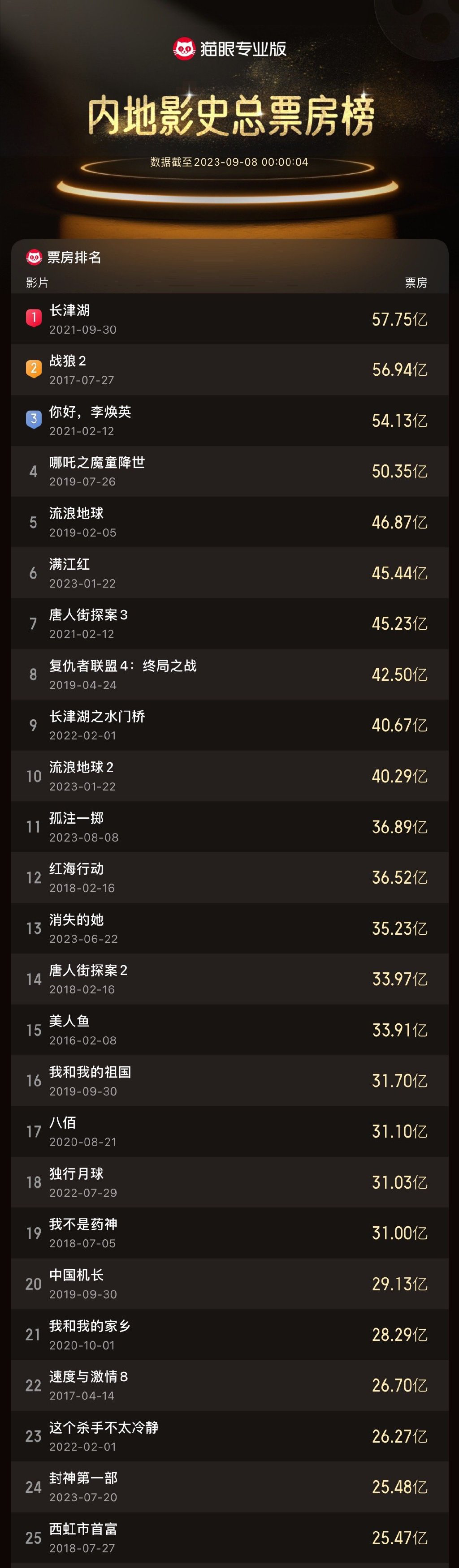据猫眼专业版数据显示,电影《封神第一部》票房突破25.48亿,超过《西虹市首富》25.47亿票房成绩,进入中国影史票房榜第二十四名。
